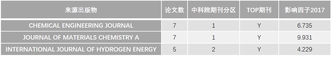 公司作为第一署名单位或通讯作者单位ESI高影响论文发文量前3的来源出版物分别是《CHEMICAL ENGINEERING JOURNAL》、《JOURNAL OF MATERIALS CHEMISTRY A》、《INTERNATIONAL JOURNAL OF HYDROGEN ENERGY》,其他期刊的发文量均在2篇以下。