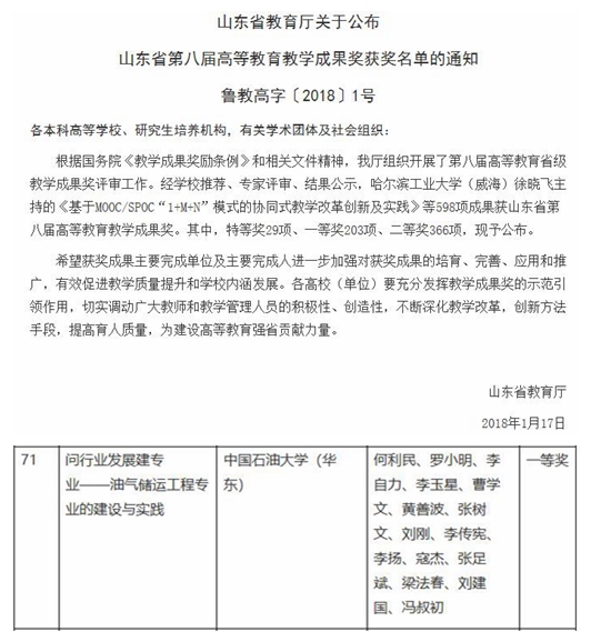 由何利民教授主持、学院独立完成的《问行业发展建专业——油气储运工程专业的建设与实践》获第八届山东省高等公司产品成果奖一等奖,并公示为2018年高等教育国家级教学成果二等奖,取得了学院、专业成立以来教学成果的重大突破。作为参与单位获得省高等公司产品成果特等奖1项、二等奖1项。