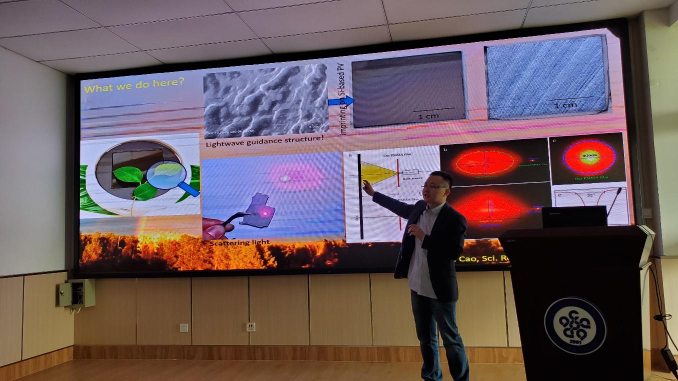 报告中,曹教授结合多年来的自身经历及科研实践,深入浅出的介绍了从XPS(X射线光电子能谱分析)、同步辐射X光源、第一性原理、超原子属性、空气电池等学术前沿基础概念,到0维团簇、纳米颗粒、新一代储能电极材料和新型仿生光学材料等研究领域的最新成果。在新型仿生光学材料研究介绍中,曹教授团队从生活中常见的绿色植物叶子表面比较粗糙受到启发,通过研究发现叶子表面微观结构的不同会直接影响叶子吸收光的能力,通过研究其中的物理原理,并使用第一性原理模拟并设计出具有最佳减反效果的微结构表面形态。其团队把此理念应用到太阳能电池板上,对其表面进行改造,大大提高了太阳能电池的发电效率,该成果能够被众多发展中国家充分利用从而为亟待解决的清洁能源问题提供高效可行的方案。曹教授的报告让在场师生深刻体会到了日常生活中常见的现象与科学研究的紧密联系,令人印象深刻,引起场下科研工作者的共鸣。最后曹教授详细回答了同学们提出关于硫化钼如何与另外一个电极紧密接触的微观原理等问题,给从事相关领域的研究人员提供了新思路。