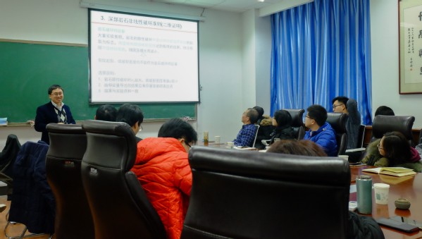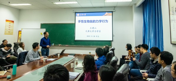 报告中,黄再兴教授从目前润湿模型存在的困境出发,讲述了目前的润湿性模型所遇到的问题,并针对这些问题提出看法。重点介绍了其在引入固体弹性反作用力、考虑三相线张力效应等方面的最新研究,提出新的润湿性理论模型,并对重力影响下的表面效应、新模型的实验验证和如何发展系统的测量方法与仪器等尚未解决的问题进行讨论。王建山教授对手性生物丝的力学行为进行讲解,主要介绍了手性生物丝的重要研究意义,其形成的物理机制,卷须负重攀附行为的力学机制,手性纤维的拉伸行为等最新研究成果,并对以后的研究进行了展望。左建平教授基于对多尺度岩石破坏及岩层移动模型的描述,讲解了经典岩层移动模型,提出深部岩石非线性破坏准则的二维证明方法、采动覆岩移动的“类双曲线”模型、H-B经验破坏准则的三维证明方法等。会后,与会师生与各位专家进行了深入的交流和讨论。
