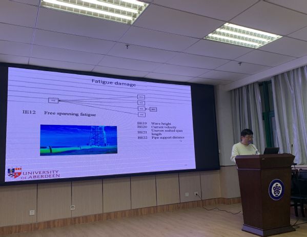 报告中,谭鸿来教授首先介绍了北海海域海洋结构物在役寿命的相关研究背景。随后对其团队对海底结构物寿命估算及其可靠性研究进行了详细介绍,重点介绍了贝叶斯网络在评估海底在役管道失效概率中的应用,其方法将传统力学理论、大数据统计及工程经验较好结合,为今后的预测海底结构物使用寿命提供新的研究思路。最后,谭鸿来教授论述了贝叶斯网络对预测在役海底管道失效概率的未来应用前景。在互动环节中,谭鸿来就具体的工程实例与参会师生进行了广泛的学术交流,详细的回答了有关贝叶斯网络与其在使用过程中的关键技术问题的提问,提出大数据收集、实验与理论紧密结合的研究方法。谭鸿来教授在汇报期间,结合自身经历鼓励研究生要努力培养科研兴趣,争取更多的学术交流机会,产出更多优秀科研成果。