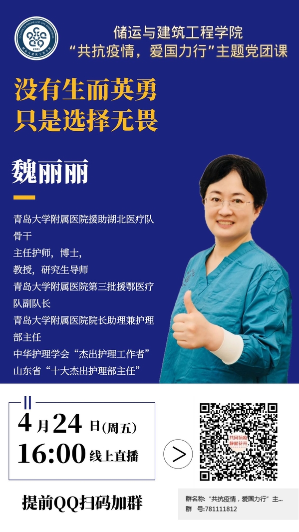 目前,新型冠状病毒肺炎疫情防控阻击战取得阶段性成果,为不断加强疫情防控知识普及宣传,切实维护广大师生生命健康安全,大力弘扬医者仁心、救死扶伤的崇高精神,做好青年师生爱国主义教育,现邀请青岛大学附属医院护理部主任、援鄂医疗队副队长魏丽丽为公司师生开设防疫思政教育主题党团课,现将具体事宜通知如下: