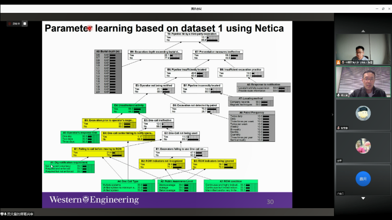 2020年11月17日,williamhill威廉希尔官网邀请加拿大韦仕敦大学(Western University)周文星副教授,远程为公司师生做《贝叶斯网络在油气管道完整性管理中的应用》的云端学术讲座,来自大连理工大学、北京工业大学、中国矿业大学的学术同仁也在线上参加了本次讲座。