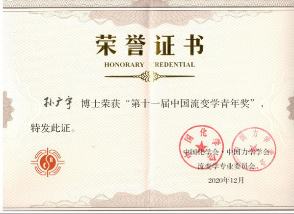 2020年12月7日,经专家推荐、网上函评和中国化学会、中国力学学会流变学专业委员会现场答辩评审,公司教师孙广宇于重庆市荣获第十一届中国流变学青年奖。