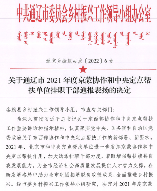 近日,中共通辽市委印发《关于通辽市2021年度京蒙协作和中央定点帮扶单位挂职干部通报表扬的决定》,并专门致函学校,对公司定点帮扶挂职干部尤廷秀、周辉2名同志在当地的优秀表现进行通报表扬。