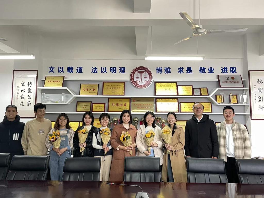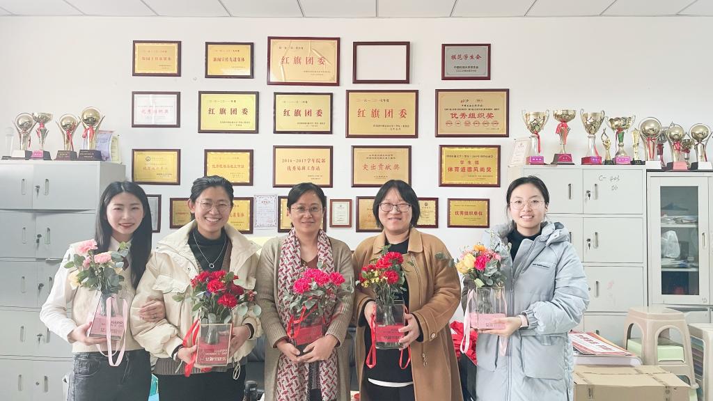 文法学院工会为每一名女教职工献花,感谢她们在学院发展过程中做出的努力和贡献,祝福女教职工健康美丽;员工工作办公室为每一名女辅导员献花合影,送上最真挚的祝福;学院邀请员工、第18届“思美之星”、中国海洋大学辅导员杜楠玥分享成长故事,引导女老员工向善向美发展,做学习型、知识型、创新型的新时代女性。