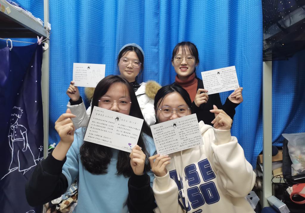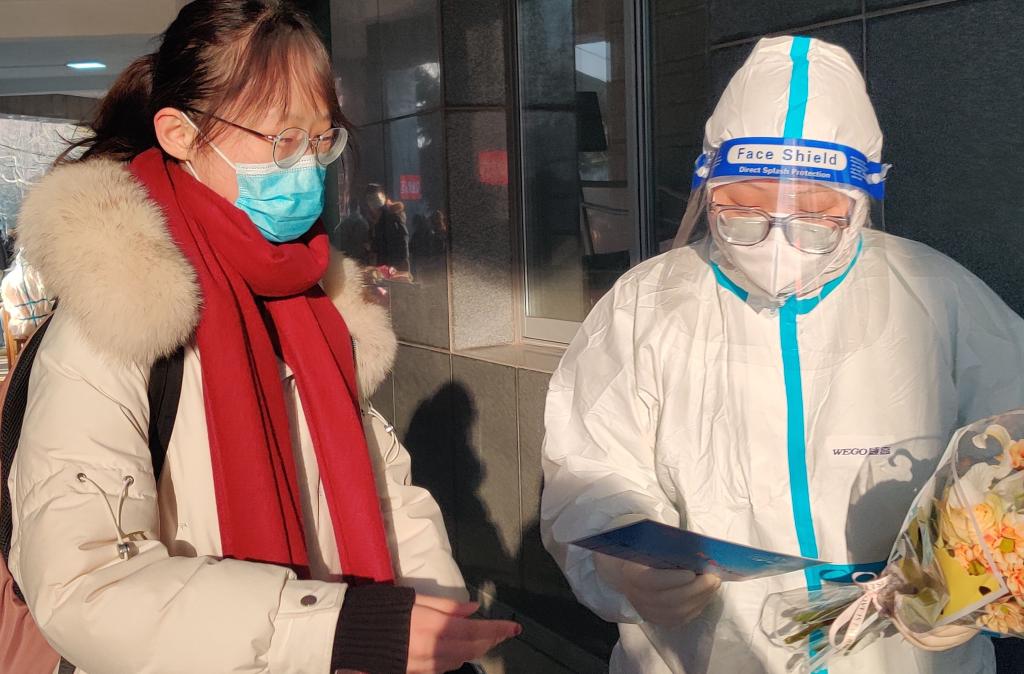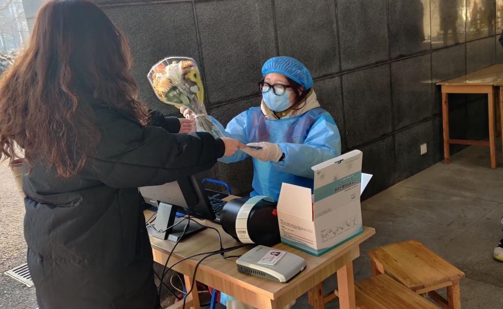 海洋与空间信息学院地信1901班同学们为核酸检测的医务人员赠送精心准备的贺卡和鲜花,表达感谢和祝福