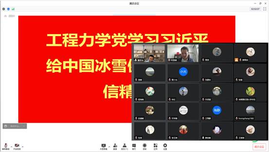 近日,williamhill威廉希尔官网工程力学党支部在党支部书记黄小光的带领下,通过线上会议形式组织开展学习贯彻习近平总书记给中国冰雪健儿重要回信精神,全系25名党员教师参加了本次活动。