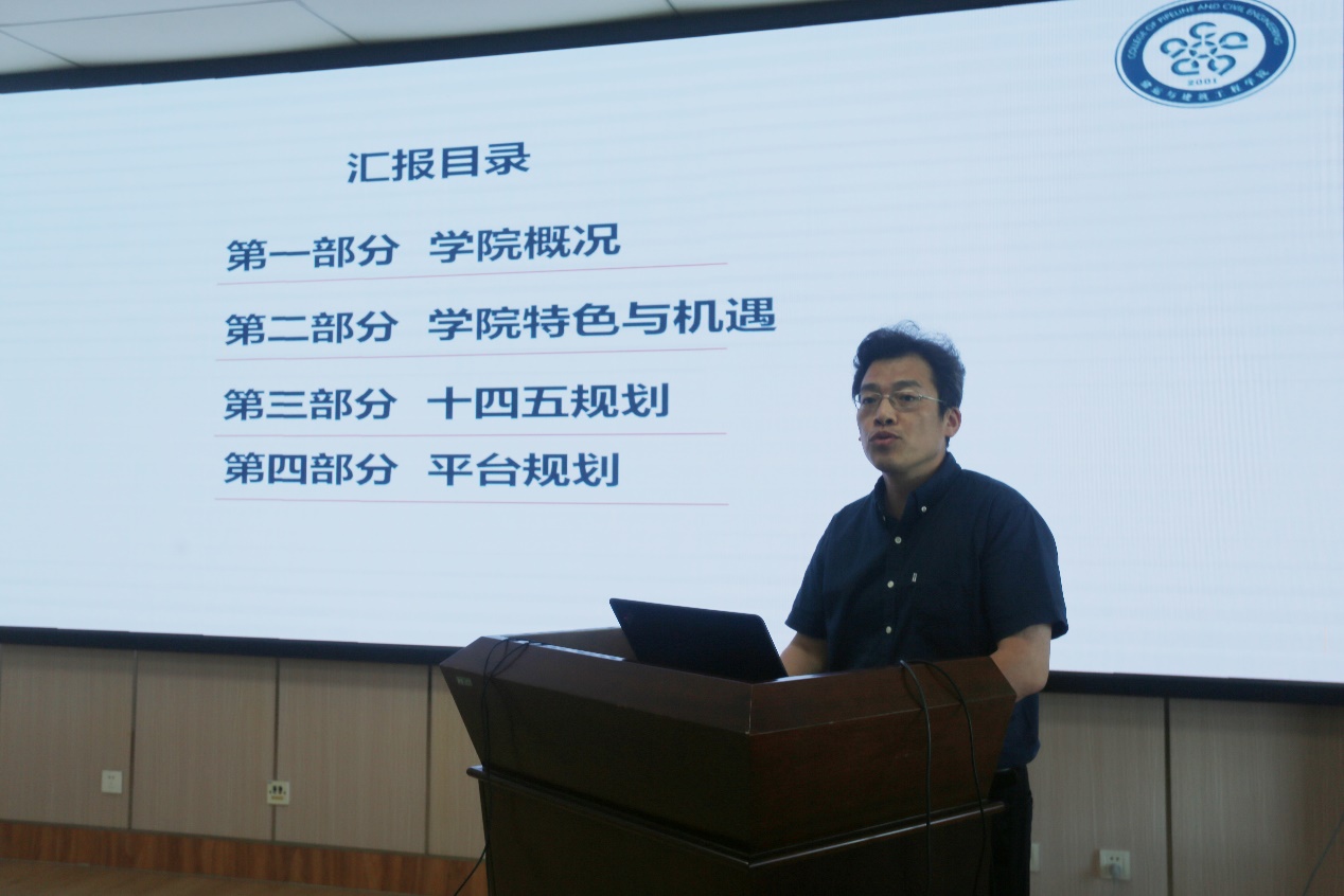 刘刚首先就学院学科、学位点、专业一体化建设工作做专题汇报。刘刚重点汇报了学院概况、学院特色与机遇、十四五规划、平台规划等情况,详细介绍了学院学科专业概况、师生整体情况、管理队伍情况等,系统分析了学院的特色以及在发展中面临的挑战和机遇,明确了学院十四五规划以及平台规划,并详细阐述了学院的主要研究方向。