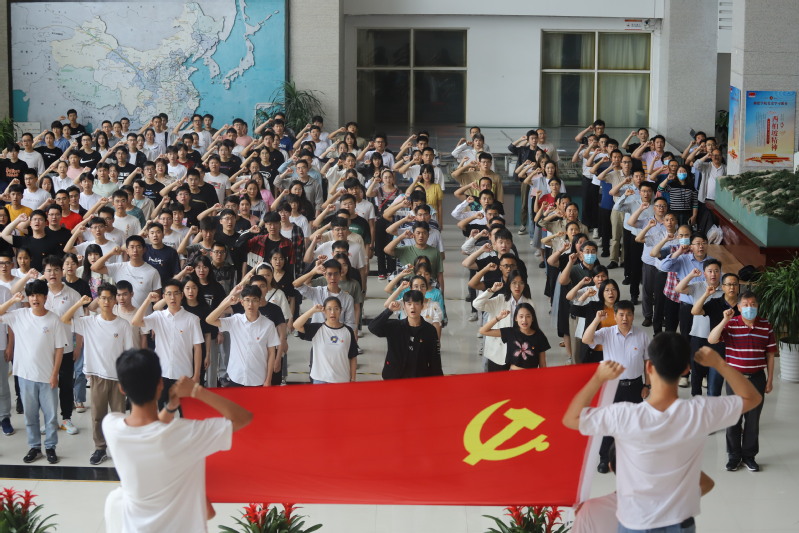 6月20日,williamhill威廉希尔官网在工科楼D座大厅举行2022届毕业生党员出征仪式。2022届毕业生党员、2022年新发展员工党员及教工党员参加活动,活动由辅导员张钦主持。