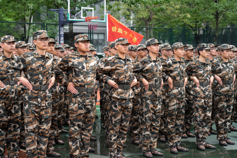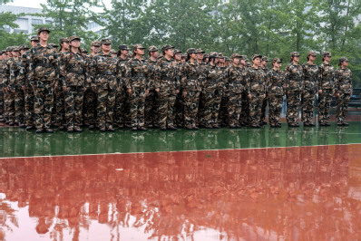 会后,储建学子立即进入训练状态,重温军姿、立正、稍息、停止间转法等,任由雨水潇潇,也浇不灭军训教官与学子心中的烈烈热情,打不败意气风发的储建学子。