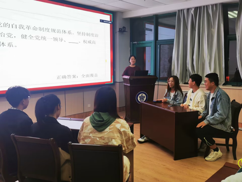 随后,举行二十大知识竞赛,旨在引导全体党员及团员同志进一步深入学习贯彻党的二十大精神,学深悟透习近平新时代中国特色社会主义思想。以赛促学,以学促行,以党建带团建,充分发挥党团联合的巨大优势,根据党团联合学习小组将知识竞赛分为一、二、三、四、五和党团支委六个小组。竞赛围绕关于二十大报告的100题、党章等学习重点,以填空题、选择题的形式采取现场答题进行测验,六个组抽签确定两两PK对手,获胜方进入下一轮继续答题。竞赛现场纪律严明、秩序井然,6支参赛队比实力、讲策略,面对答题沉着冷静,认真思考、精彩作答,充分展现了过硬的理论功底和良好的精神风貌。随着比赛环节的层层递进,赛况也变得更为焦灼。历经千帆过,终得万木春,最终第三党小组、第一党小组、支委小组分获一、二、三等奖。在知识竞赛后的讨论中,柳腾、张慧霖、秦泊雨、于帆、孔冉等同志积极发言,阐述对党的二十大精神的理解及学习感想。