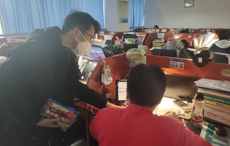 在图书馆研读区,毕业班辅导员郑健、韩栋庭、安梓恺等人关心问候了同学们的复习进展,并与大家分享考试心得,鼓励大家坚定信心,振奋精神,劳逸结合,以最好的状态迎接属于自己的“大考”。郑健表示,公司及各位老师一直牵挂大家,希望大家都能成功圆梦。“时间走到这一天,其实每位考研的同学都是胜利者,靡不有初,鲜克有终,我们决定开始都很简单,只不过,大部分人走不到终点,所以,坚守本身就是一种成功,况且现在你付出的每一分努力将来都会有所收获,眼下,知识的问题已经不再是问题,重要的是调整好心态,保持良好的生活作息,积极阳光地面对考试,顺利到达属于自己的彼岸。”接过温情满满的文具“福袋”和N95型防护口罩,同学们也十分开心,纷纷对学院老师们送来的礼物和祝福表示感谢。