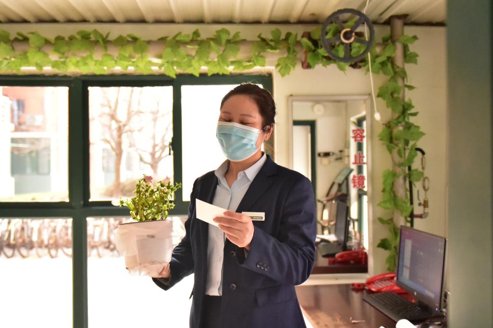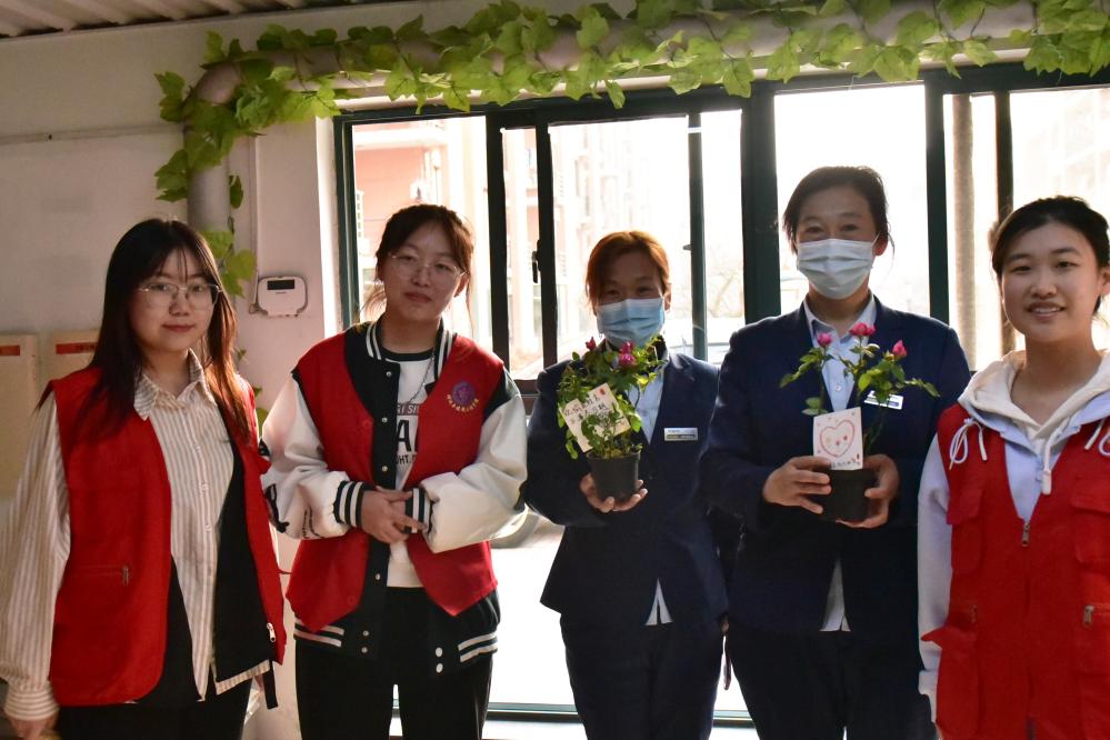 春寒料峭,乍暖还寒。今日的暖阳和召旭志愿者红色的身影共同出现在石大校园中。召旭服务队拜访各寝室楼的宿管阿姨,送上精心制作挑选的鲜花盆栽和贺卡。一场“感恩”暖流蔓延开来。 “阿姨,你们辛苦了!祝你们妇女节快乐。希望你们身体健康,天天都有好心情。”志愿者们郑重地把花和贺卡递到宿管阿姨的手里并祝福节日快乐。阿姨们在收到志愿者们的花和祝福后,都感到非常惊喜与开心。“太感谢同学们了,我得好好地和你们拍个照。”13号楼宿管阿姨在接受到送的花后,还郑重去换上工作服并整理头发和志愿者合影。世界因女性而变得更加美丽,一个小小的问候,却是一份浓抹的深情。