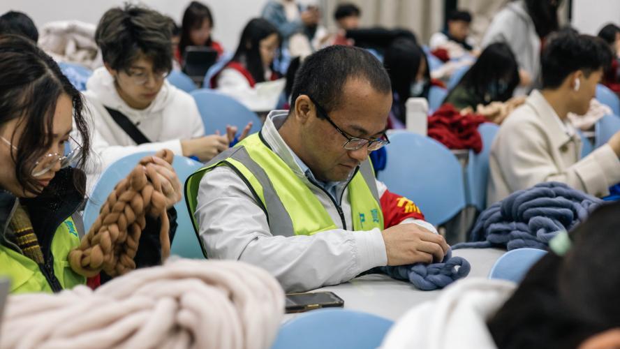 活动首先由向阳花公益助学组织介绍本次活动背景和目的,播放教学视频并讲解步骤。在志愿者讲完编织步骤后,四个组织70余名志愿者们都对织围巾产生了很大的兴趣,积极而投入地参与其中。照着视频演示徒手织围巾的第一步“穿环”,一开始,志愿者们们进度不一,松紧有别,围巾看起来还不是很均匀,但是同学们并不气馁,他们在拆了又织,织了又拆的重复过程中,逐渐掌握了织围巾的技巧,越来越熟练越来越漂亮。这样一条围巾,织进去了同学们满满的心意,一定是最温暖人心的。最后志愿者们写下了对孩子们的祝福,挂在了自己织的围巾上,“希望那边的孩子会喜欢我的围巾,更希望他们开心快乐得像小太阳一样”,一位志愿者拿着自己织的围巾说道。