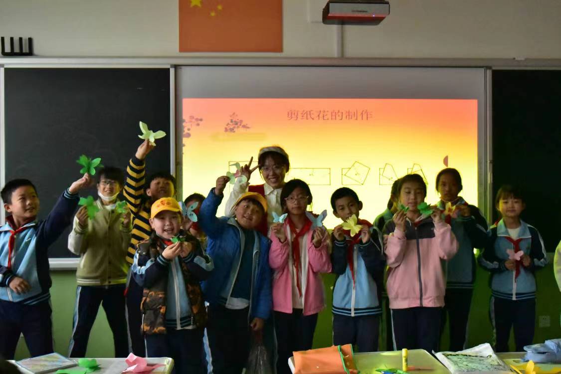 剪纸课后王晓悦同学与小朋友们的合影(胡笑菲摄)
