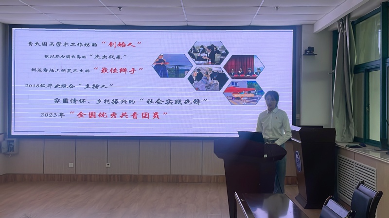 随后,来自青岛大学的全国优秀共青团员徐嘉欣结合个人学习、员工工作、社会实践三方面经历进行了“砥砺强国之志,实践报国之行”主题汇报。从学业成绩连续三学期排名专业第一到积极参与员工工作,作为青岛大学国际关系读书会会长、学术工作坊负责人举办系列活动,再到参与暑期三下乡、七彩假期云支教等多项社会实践活动。种种经历向与会成员展现了青年团员应有的精神面貌。
