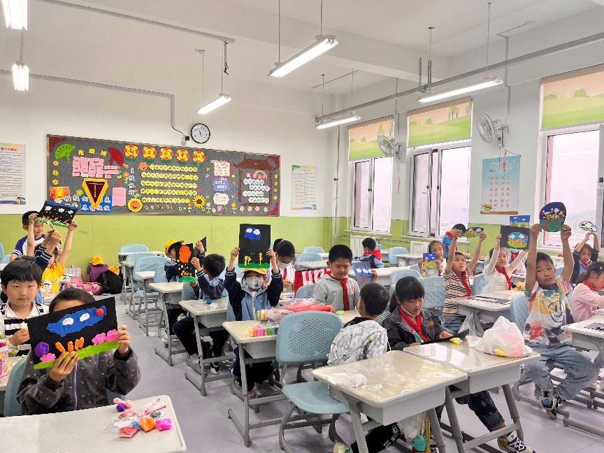 在随后的创意手工课,志愿者们先是将不同颜色的黏土分发给小朋友们,小朋友们互相礼貌地交换喜欢的颜色,以此来培养小朋友们的合作意识。每位小朋友都有一张黑色的卡纸,大家需要在规定时间内在志愿者老师的协助下用黏土完成有关“小满”节气景色的描绘。这一方面有助于小朋友们对所学知识的理解和转化,另一方面又锻炼了他们的动手能力。小朋友们对手工作业的热情十分高涨,纷纷开始了自己的创作。志愿者们则在孩子中间协助他们完成自己的创意作品,确保每一位小朋友都能创作出属于自己的“小满“景色。