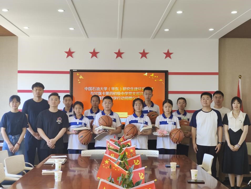 双方在甘旗卡四中会议室举行了研究生建环党支部与甘旗卡第四初级中学党支部共建暨阳光助学行动捐赠仪式,将研究生建环党支部成员捐赠的文体用品等助学物资悉数交付甘旗卡四中各班员工手中。
