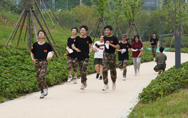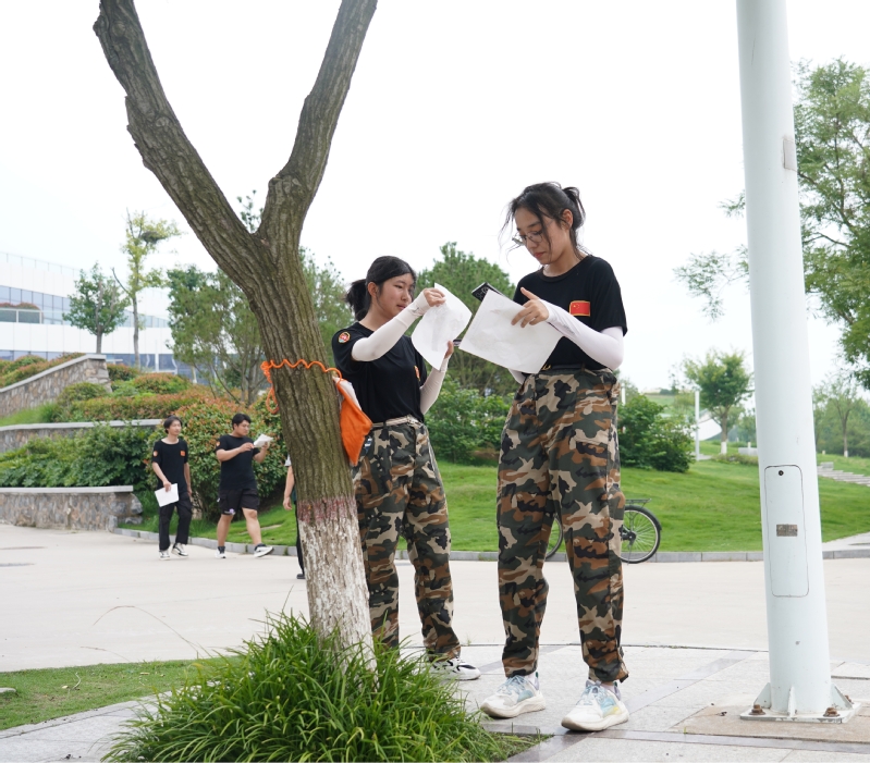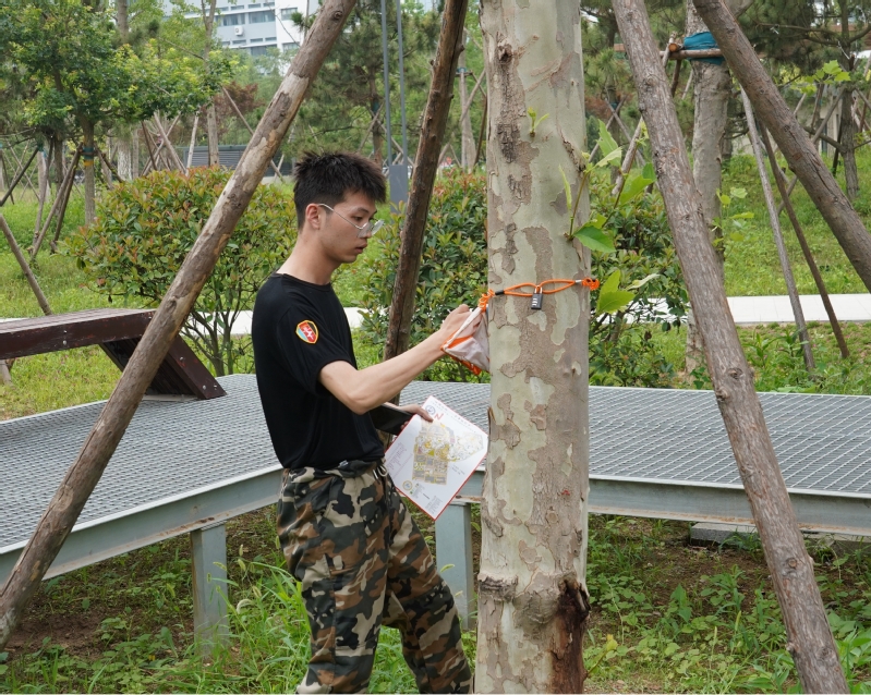 比赛过程中,各组成员齐心协力、分工明确,有人手持地图,观察地形和位置,确保以最短时间到达下一地点;有人配备指卡,负责打卡;有人是小组的“先锋”,带队奔跑。同学们奋勇当先,互帮互助,积极寻找各个站点,展示了“军人”的良好风貌和竞争意识。烈日当空,同学们在位于校园内的16个站点中奔波,完成比赛任务。经过短暂休整后,同学们又继续进行训练。