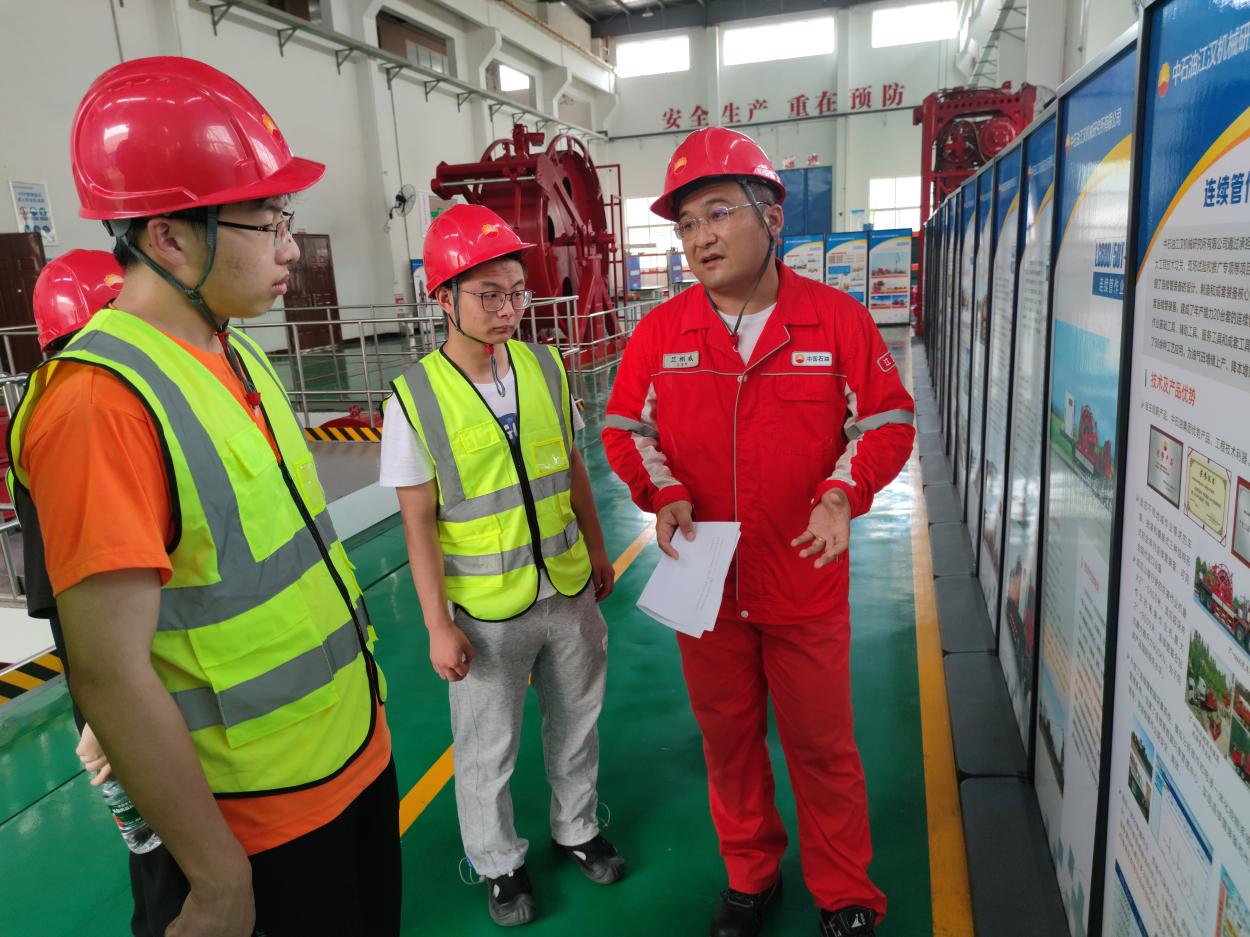 7月27日下午,实践队前往配装车间,观摩江汉所的特色核心技术——连续管技术与装备,了解该技术的应用前景与发展历程。讲解员竺老师表示:“连续管技术与装备的应用不断走向深层、超深层、非常规、新能源、深海等多个领域,作业量和作业效果日趋显著。”通过讲解员的讲解,实践队员们了解到连续管技术具有污染小、占地面积少、可带压作业等特色优势,这恰恰推动石油行业向更加高效、环保和可持续的方向发展。