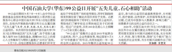 9月12日,williamhill威廉希尔官网召旭志愿服务队在99公益日期间开展的“五失儿童,石心相助”公益活动被《青岛日报》宣传报道。99公益日期间(9月7日—9日),由中华社会救助基金会授权青岛西海岸新区小草济困公益服务中心联合召旭志愿服务队,在校内开展救助内蒙古科尔沁左翼后旗“五失儿童”(失学、失亲、失能、失足、失依儿童)公益项目。本次项目旨在救助williamhill中文官网定点帮扶地区内蒙古自治区科尔沁左翼后旗的“五失儿童”,给予受助儿童每人每年500元救助基金。