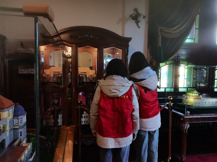 德国总督楼旧址内展览了众多历史遗产,放映了优美的历史影片,介绍了东西方交融的文化,吸引了众多游客。志愿队的同学在休息时间也自然被身边的文物吸引,上前仔细了解物品的历史背景。