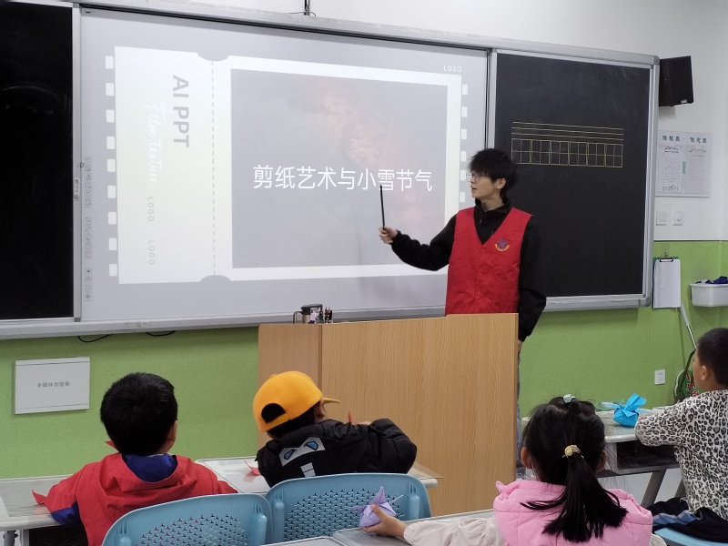 活动开始,由李攀同学为大家讲解小雪节气和剪纸艺术,带领孩子们深入了解这个冬景美如画的节气,并且结合“小雪”为小朋友们普及环境保护的知识,开展创意剪纸制作,培养小朋友们的动手能力和合作意识。小朋友们积极发言,踊跃参与,现场非常活跃。