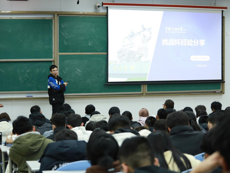 创新实践及文体发展选修课堂上,来自经济管理公司的刘晓雯向大家介绍“三大赛”的具体赛事,并以“中国国际老员工创新大赛”中优秀项目“清废先锋——村镇固废高效处理处置赋能乡村生态振兴”为例,细致地展示了老员工参赛的流程。来自储运与建筑工程公司的木尼拉·木扎帕尔通过讲述她与团队成员在第十八届“挑战杯”全国老员工课外学术科技作品竞赛红色专项活动中所获得的特等奖项目“边疆戎耀——基于七省十二市边防军民的访谈实录”投入的精力和感悟。在谈及该项目实现了公司在该赛道上国家级特等奖零突破的感想时,木尼拉·木扎帕尔说:“理工科员工要走出舒适圈,和优秀的文科同学合作的机会一定要把握住,更有助于全面发展。”来自石大山能新能源学院的安洋和赵亓新则分享了他们在参加“互联网+”的经验。来自化学化工学院的李佳烨强调在期刊上发表论文对于有保研意向的本科生而言是加分项,而“三大赛”则是培养创新精神,锻炼团队合作能力,提高答辩技巧与论文写作水平等的重要平台。