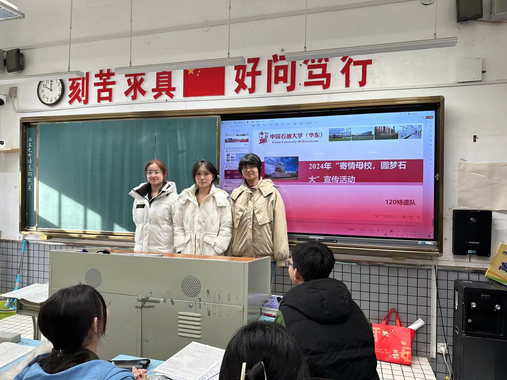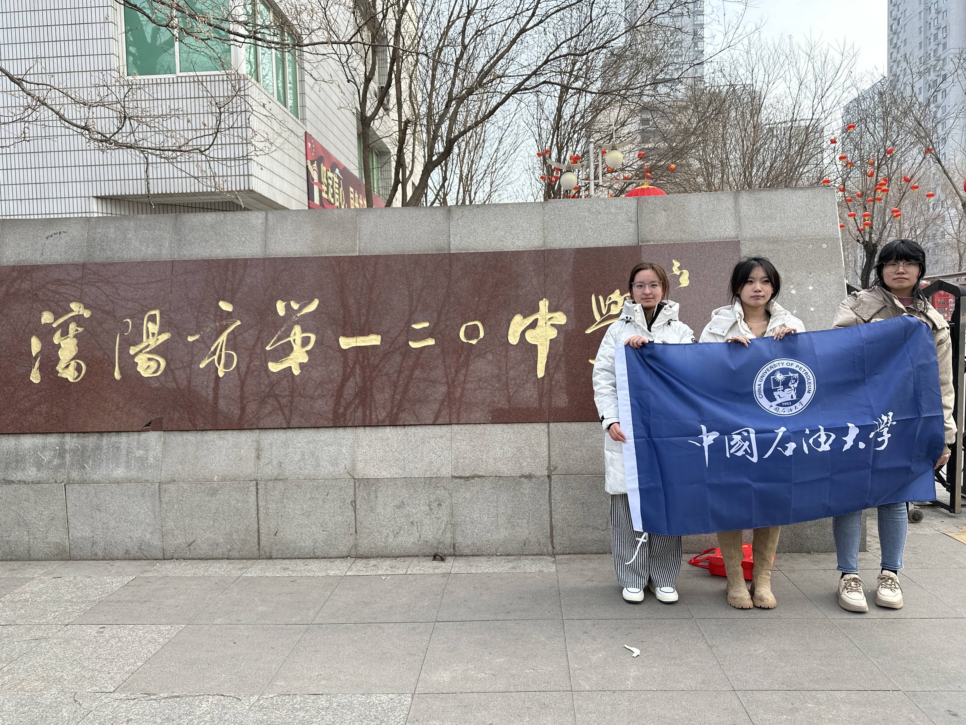 活动开始前,团队成员与高中负责人取得联系,确定了入校时间、宣传年级与宣讲班级。活动伊始,成员们进入高二16班分发招生手册,对同学们进行详细的招生宣讲。主讲人邱玉婷从建校背景、学校环境、校内资源、辽宁省录取分数线等多方面向同学们介绍石大。接着,张可欣和于佳琪分享自己的高中学习经验和老员工活,并对同学们提出的问题进行解答,留下意向生源的联系方式,与同学们留影纪念。最后,团队成员前往高三楼,在校内公示板共同张贴招生海报,为高三同学提供报考建议。