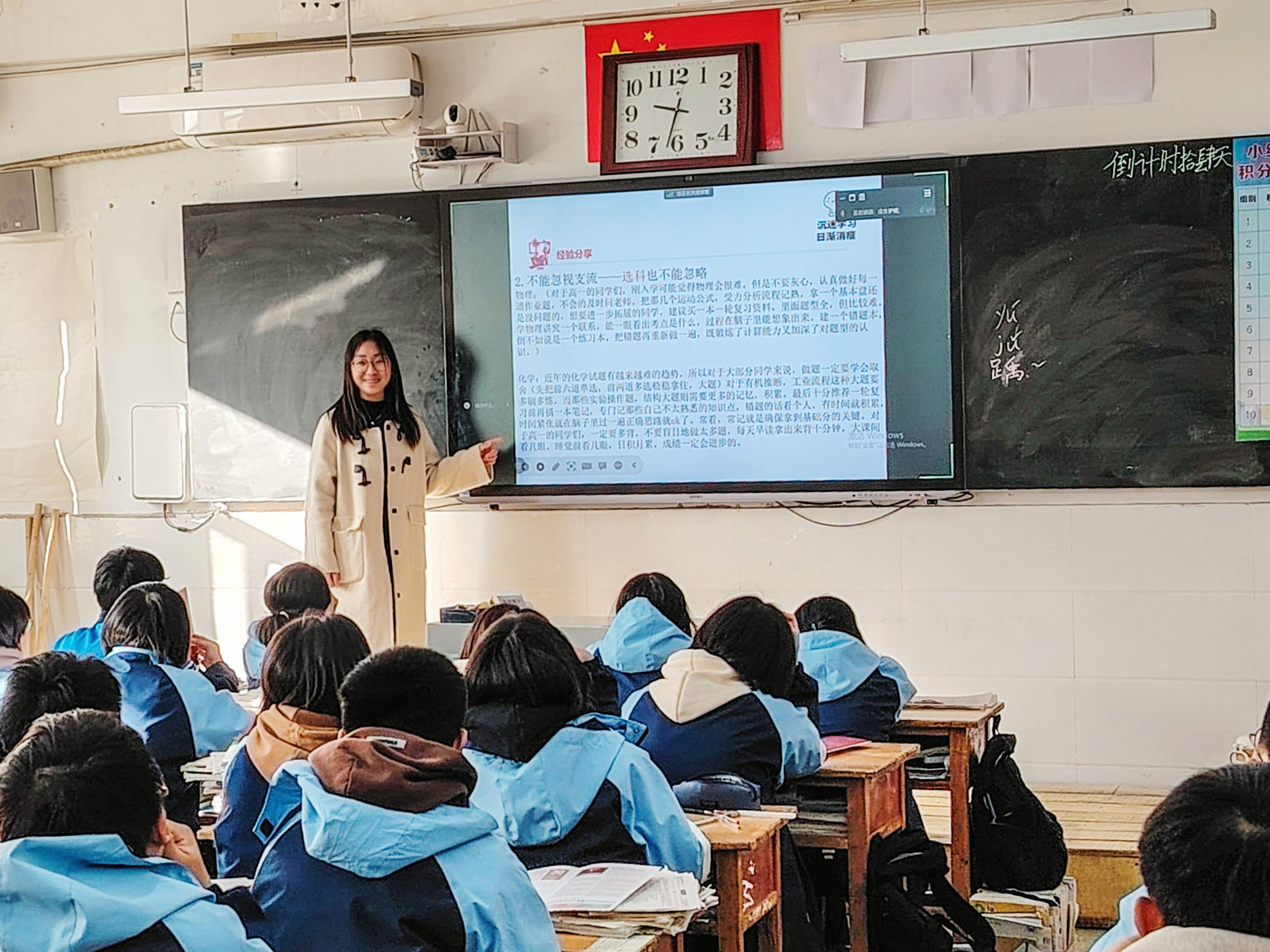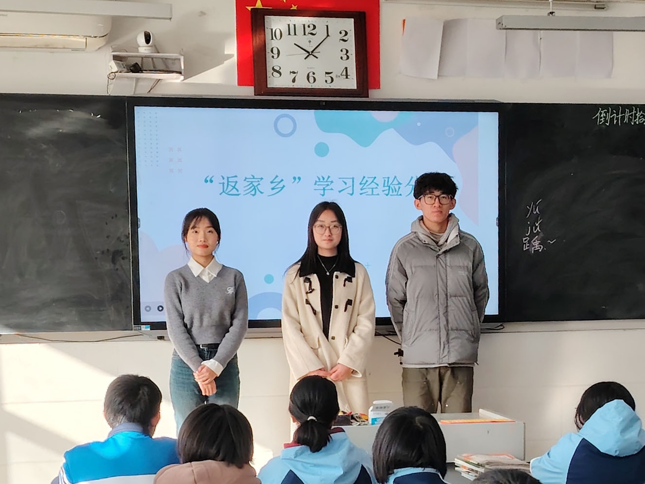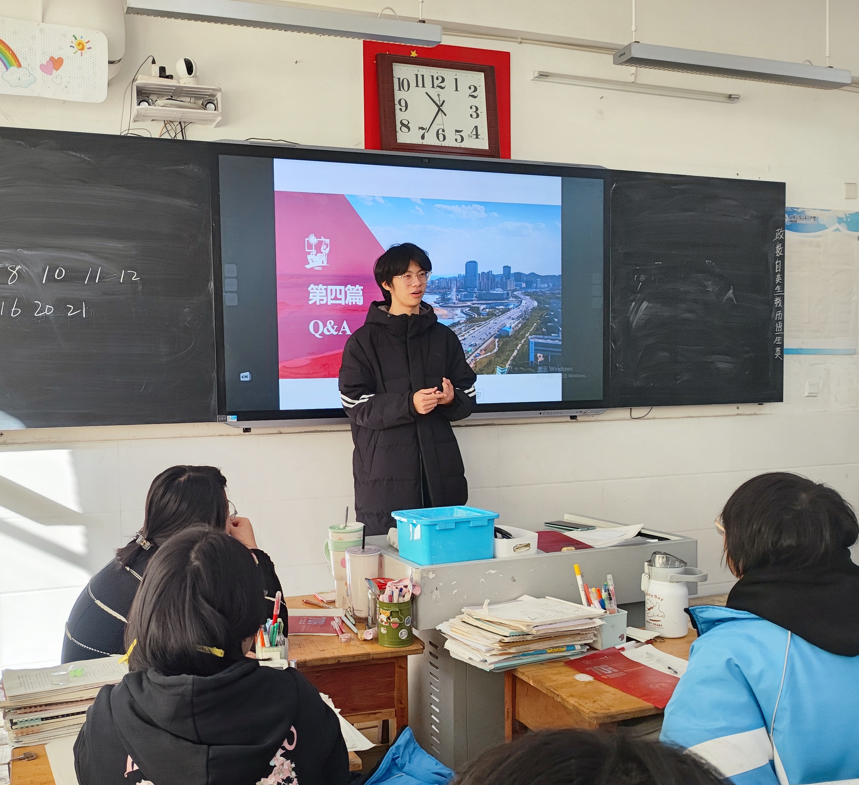 活动开始前,实践队成员与高中班主任取得联系,确定宣讲时间和班级。首先,实践队成员进入阳信一中高三九班,为同学们分发招生宣传手册并播放招生宣传片《少年·少年》。主讲人张盈盈以PPT演示的形式从学校历史、地理位置、教学资源等角度详细介绍学校,加深同学们对学校的了解。随后,张盈盈、宋杰炜先后与同学们分享自己高中时期学习各个学科和及时调整学习状态的经验。最后,实践队成员就同学们提出的有关学校的录取情况、校园生活和环境以及高中学习的问题进行回答。