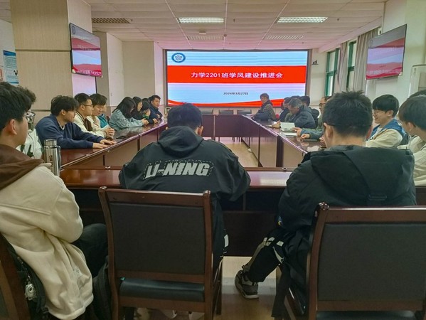 3月27日,学院组织力学2201班开展学风建设推进会,辅导员李峰弼主持会议,公司党委副书记周辉、力学系党支部书记黄小光、力学2201班班主任张毅参加会议。力学2201班班长崔继仁针对班级情况做了汇报,整理和分析了班级第一课堂、第二课堂的成绩,介绍了班级目前针对学风的工作方法,指出了目前班级学风所存在的问题,并对班级未来工作做出了计划。邵磊同学从个人的角度分享了自己对优良学风与各类赛事、科研之间关系的看法。班级其他同学也针对班级学习问题进行了交流。随后,黄小光结合班级同学课堂上的表现,给出了建议,并希望同学们加强与老师的交流,提高听课质量,提高学习成绩。张毅也结合班级日常开展的工作,指出班级目前存在的一些问题,对重点课程给予了指导。周辉最后指出,力学2201班有良好的基础,希望师生共同努力,采取切实有效的方式方法,形成具有自己力学特质的学习品牌,班级要尽快制定具有自己特色的班级学风建设方案,通过有效方案落实培育班级良好学风,打造班级成为更加优秀的集体。