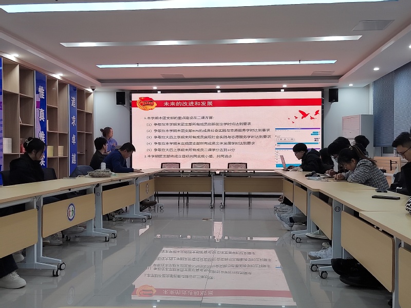 会议伊始,各团支部书记依次上台,详细汇报了本年度各自团支部的工作开展情况,着重分析了第二课堂建设的具体状况,并展示了在第二课堂工作中的突出成果和创新点,同时也指出了存在的问题与不足,并明确了下一步的改进方向。汇报内容详实而具体,充分展现了各团支部在日常工作中的积极创新与不懈努力,同时也体现了同学们在参与活动过程中的成长与进步。