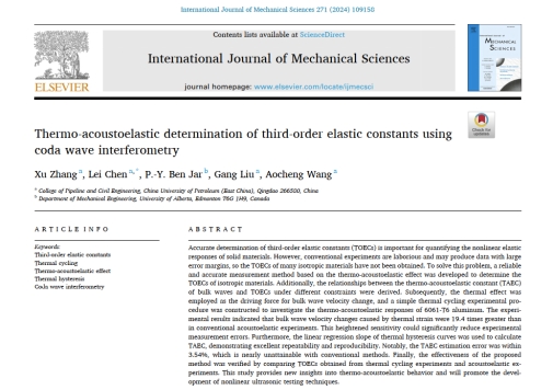 近日,公司油气储运工程学科博士研究生张旭在导波结构健康监测方面取得重要进展,相关研究成果《材料三阶弹性常数的热致声弹性测定方法》(Thermo-acoustoelastic determination of third-order elastic constants using coda wave interferometry)发表在《International Journal of Mechanical Sciences》。《International Journal of Mechanical Sciences》是机械工程领域的国际顶级期刊,目前影响因子为7.3(SCI一区Top)。论文第一作者为博士研究生张旭,通讯作者为陈雷教授,合作作者包括刘刚教授和P.-Y. Ben Jar教授(加拿大阿尔伯塔大学),williamhill中文官网为第一署名单位和唯一通讯单位。