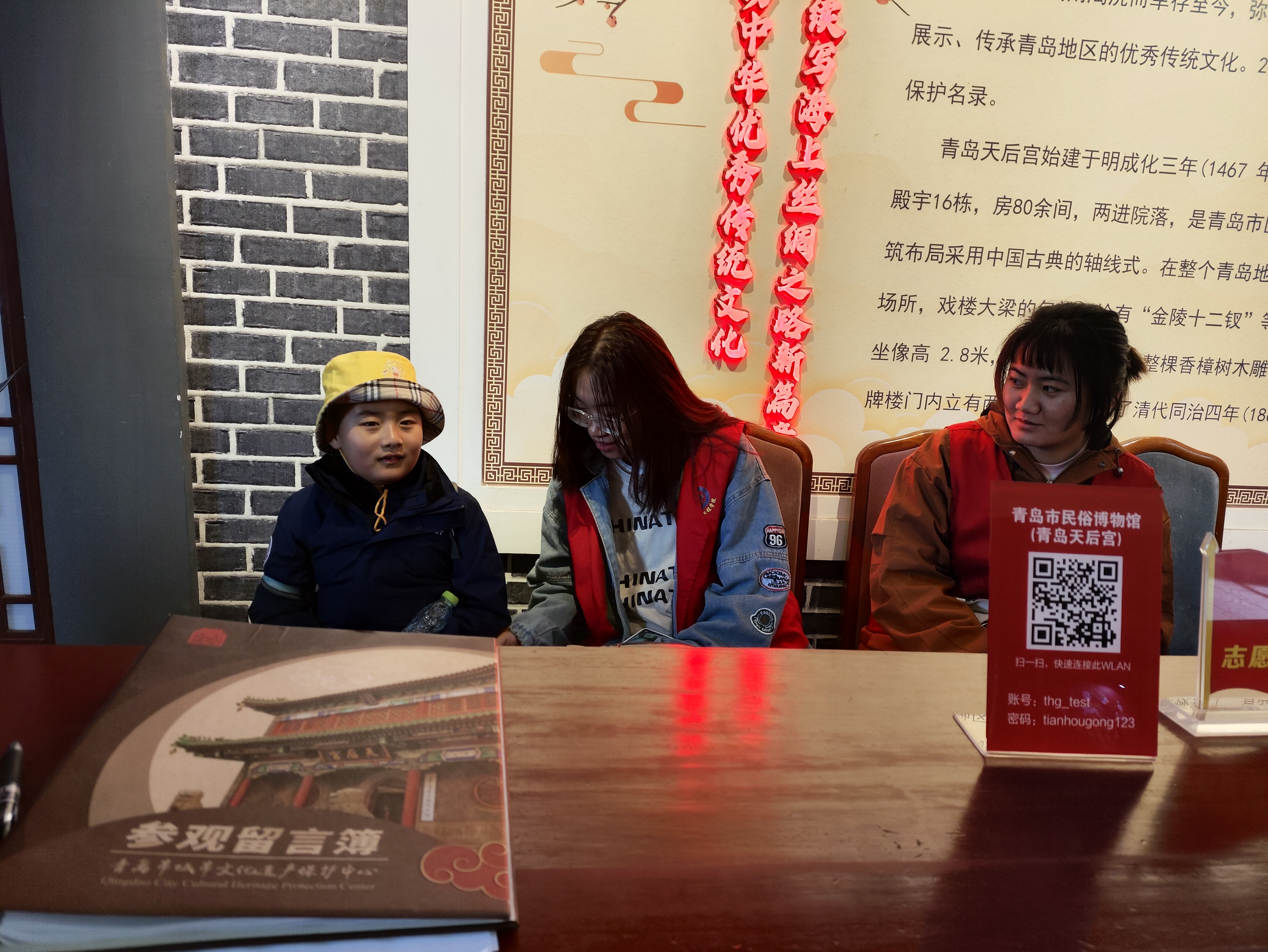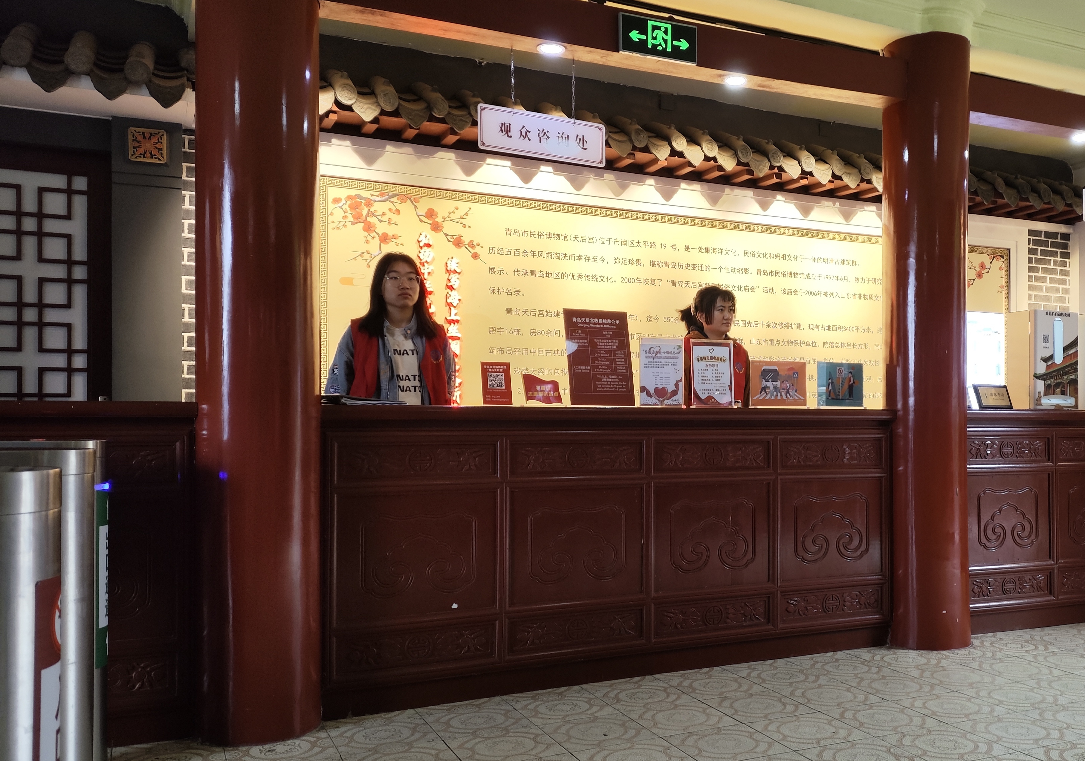 4月13日,召旭志愿队的志愿者们走进了市南区一座富有深厚文化底蕴的建筑群——青岛市天后宫开展志愿服务。志愿者们在观众咨询处的学雷锋服务站点为游客提供咨询服务。