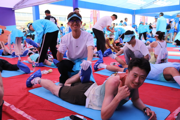 4月21日,2024青岛马拉松圆满落幕。williamhill威廉希尔官网173名青年志愿者代表学校参与本次马拉松赛后恢复和拉伸的志愿服务工作,助力保障赛事顺利进行。
