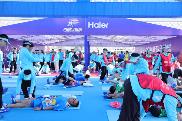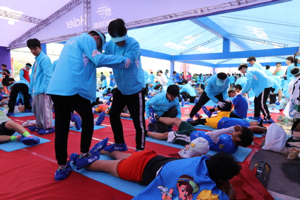 抵达青岛马拉松赛后恢复志愿服务场地 钟应奇摄