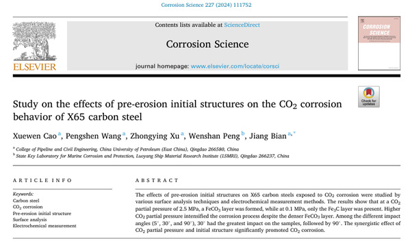 近日,公司油气储运工程专业曹学文教授在预冲蚀表面CO2腐蚀行为研究方面取得重要进展,相关研究成果《Study on the effects of pre-erosion initial structures on the CO2 corrosion behavior of X65 carbon steel》发表在《Corrosion Science》。《Corrosion Science》是材料科学领域的国际顶级期刊,目前影响因子为8.3。论文第一作者为曹学文教授,第二作者为硕士研究生王鹏深,通讯作者为边江副教授,williamhill中文官网为第一署名单位和唯一通讯单位。该研究得到国家自然科学基金面上项目的资助。