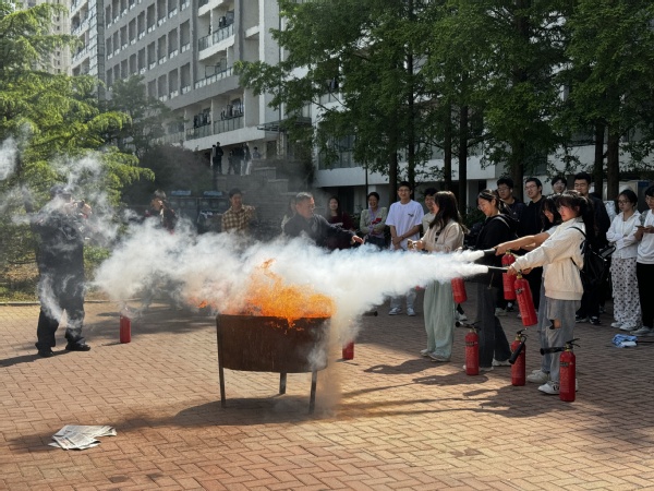 讲座结束后,在消防科工作人员的引导下,全体成员移步室外,孟祥钰为参与的同学介绍了灭火器的工作原理,以及如何根据不同的起火原因选择不同的灭火器。部分同学通过亲身实践体验基本了解了灭火时的站位、灭火的方式等。