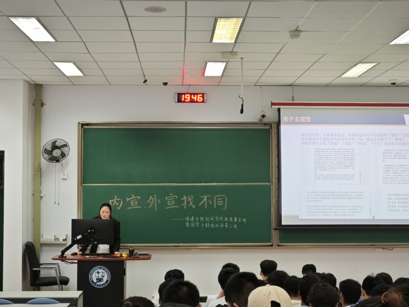 随后,谢铠伊对新闻外宣的注意事项做了详细讲解。她强调外宣工作要抢占先机,突出亮点,避免内容的重复和模板化。她通过举例分析,指出了拟写标题时的常见错误,并传授了如何运用“一句话标题”来突出新闻亮点的方法。最后,谢铠伊从话术使用、标点符号和衔接语的正确使用、避免主观性三个方面进行了详细的阐述,为同学们提供了宝贵的建议和指导,鼓励同学们在写作时要保持客观务实,准确简练,以提升新闻稿件的质量和传播效果。