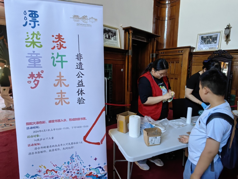 志愿者在漆扇体验岗位 张茗竹摄