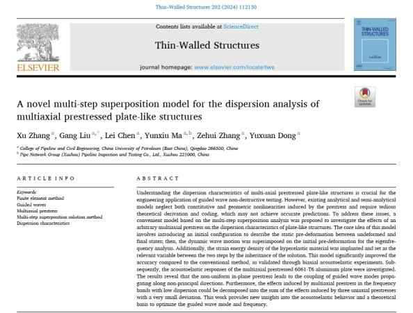 近日,公司油气储运工程学科博士研究生张旭在预应力板壳结构的导波频散特性研究方面取得新进展,相关研究成果《A novel multi-step superposition model for the dispersion analysis of multiaxial prestressed plate-like structures》发表在《Thin-Walled Structures》。《Thin-Walled Structures》是薄壁结构领域的国际顶级期刊,目前影响因子为5.7(SCI一区Top)。论文第一作者为博士研究生张旭,通讯作者为刘刚教授,合作作者包括陈雷教授和博士研究生马云修等,williamhill中文官网为第一署名单位和唯一通讯单位。该研究得到williamhill中文官网研究生创新基金项目的资助。