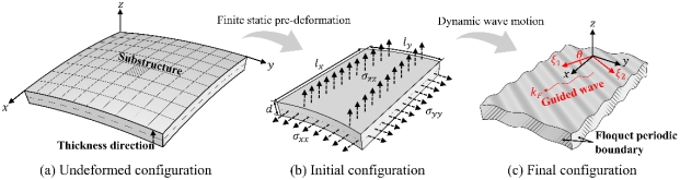 明确多轴预应力板壳结构的频散特性对于导波无损检测的工程应用至关重要。然而,现有的解析和半解析模型忽略了预应力引起的本构和几何非线性,无法实现准确计算预应力对导波相速度和群速度的影响。针对上述问题,论文提出了一种多步叠加分析模型来研究多轴预应力板壳结构的导波频散特性。该模型的核心思想是引入一个初始构型来描述未变形状态和最终状态之间的静态预变形,并将弹性波扰动叠加在初始预变形上进行特征频率分析。其中,超弹性材料的应变能密度通过解继承被设为两分析步之间的相关变量。