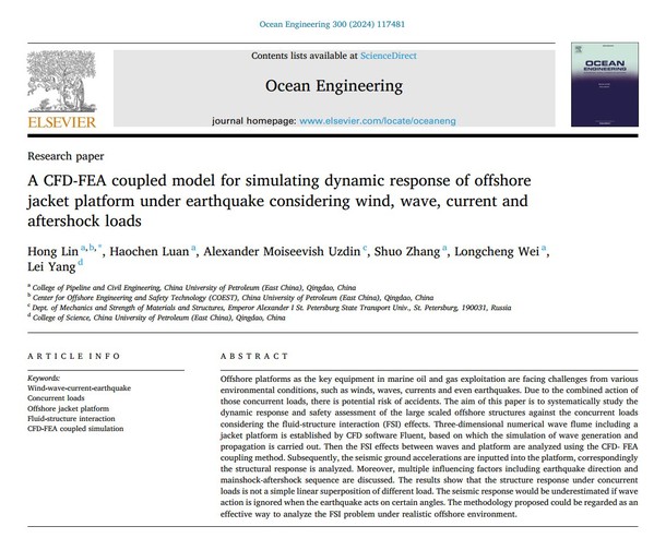 近日,公司林红副教授团队在海洋石油平台耦合灾害响应数值模拟研究方面取得新进展,相关研究成果《考虑风-浪-流和余震载荷的海洋导管架平台动力响应CFD-FEA耦合模拟》(A CFD-FEA coupled model for simulating dynamic response of offshore jacket platform under earthquake considering wind, wave, current and aftershock loads)发表在《Ocean Engineering》。《Ocean Engineering》是海洋领域的国际顶级期刊,最新影响因子为4.6(SCI二区)。论文第一作者及通讯作者为林红副教授,williamhill中文官网为第一署名单位和唯一通讯单位。该研究得到国家自然科学基金面上项目及中-俄国际合作与交流项目、中央高校基本科研业务费项目的联合资助。