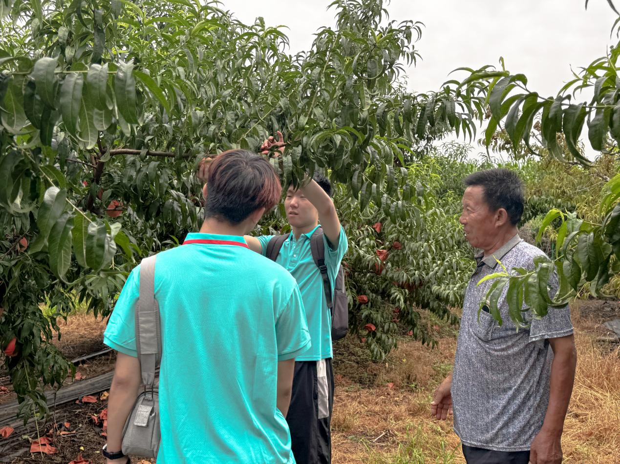 上午,实践队成员来到肥城桃科普教育基地(新农发肥桃有机种植合作社),跟随果农脚步,亲身体验摘桃,了解肥城桃的种植与采摘过程。果农们为实践队成员们亲自示范,耐心讲解着每一个环节的要点和技巧,分享了判断桃子的成熟度和根据大小、色泽、外观有无瑕疵等标准筛选的方法,确保每一个进入市场的桃子都品质优良。实践队成员在采桃过程中仔细甄别,认真挑选。