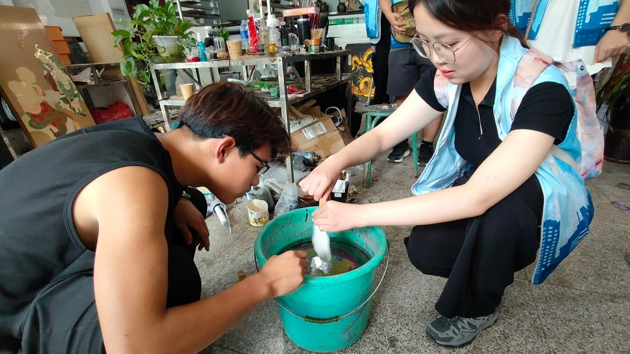 刘煜老师介绍,为了解决漆画在夜晚灯光下反光造成的光污染问题,他们创新性地将亮光面改为磨砂面,使得漆画更贴近大众生活。在体验环节,实践队员在刘煜老师的指导下,亲自制作了漆扇,感受到了传统工艺的魅力。