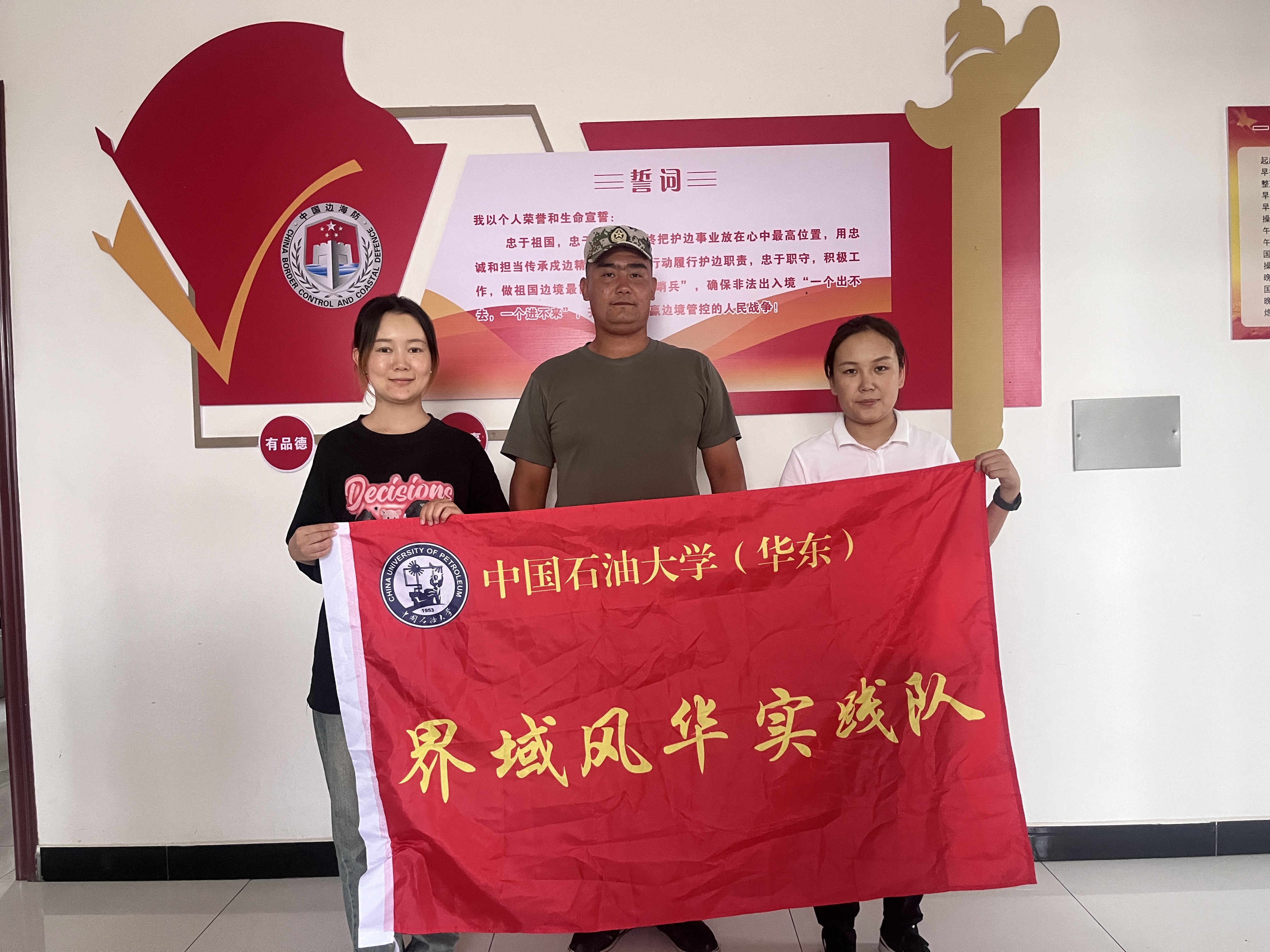 实践队成员与边防官兵站岗合影 曲亚楠摄