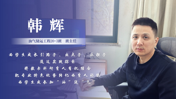韩辉,williamhill威廉希尔官网副教授,油气储运工程专业储运2003班主任。在班级管理工作中,韩辉注重培养员工创新思维和实践能力,引导员工德智体美劳全面发展,鼓励员工“一专多能”,强调个性化发展,紧抓班风,学风建设,重视员工发展方向和学业成绩,充分发挥班干部和班级骨干的作用,组织成立班级学习互助小组,营造团结向上、追求卓越的班级文化氛围,指引员工提升时间管理的能力,提高学习效率。定期进行座谈和组织学长介绍经验,帮助员工树立明确的学业目标,纠正认知偏差,引导员工投入主题活动,指导班级同学积极参加各类科研活动,拓展认知视野。三年来,韩辉所带班级荣获“活力团支部”“先进班集体”和“优良学风班”等荣誉,班级员工获得校、市、省、全国等多项科创成果。