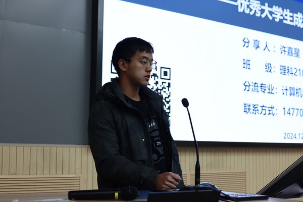 来自青岛软件学院、计算机科学与技术学院的许嘉星则分享了《如何将科研应用于学习之中》。他保研北大,拥有丰富的科研经验。他讲述了自己的保研经历,分享了保研加分的竞赛以及帮助同学们学习的网站资源。在问答环节,他鼓励大家“多尝试、多思考、多总结”,以科研精神推动学习进步。