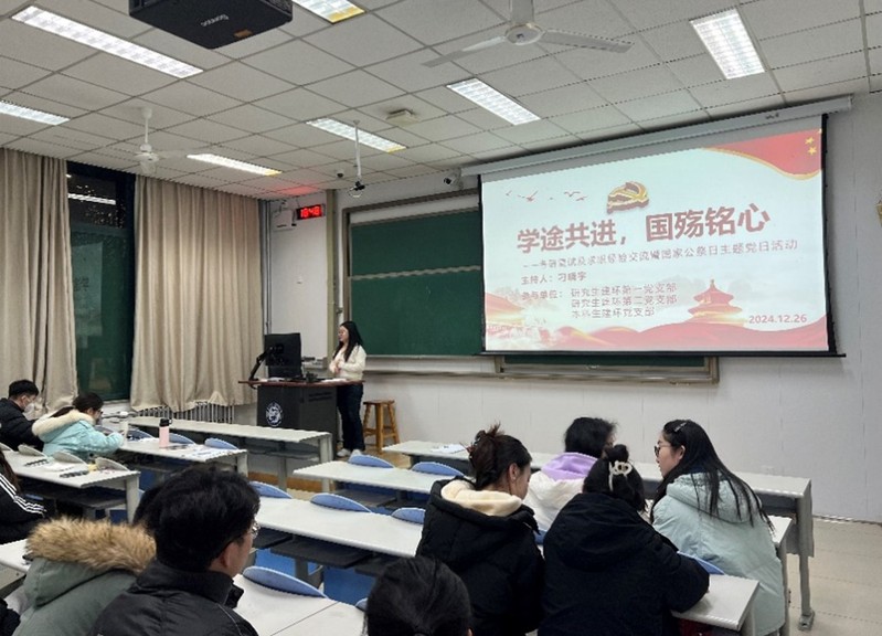为了弘扬爱国主义精神,缅怀为民族独立和国家尊严献出生命的革命先烈,2024年12月26日晚19:00,研究生建环第一党支部、研究生建环第二党支部、本科生建环党支部共同在南堂115教室联合开展了以国家公祭日为背景的观影《金陵十三钗》党日活动。